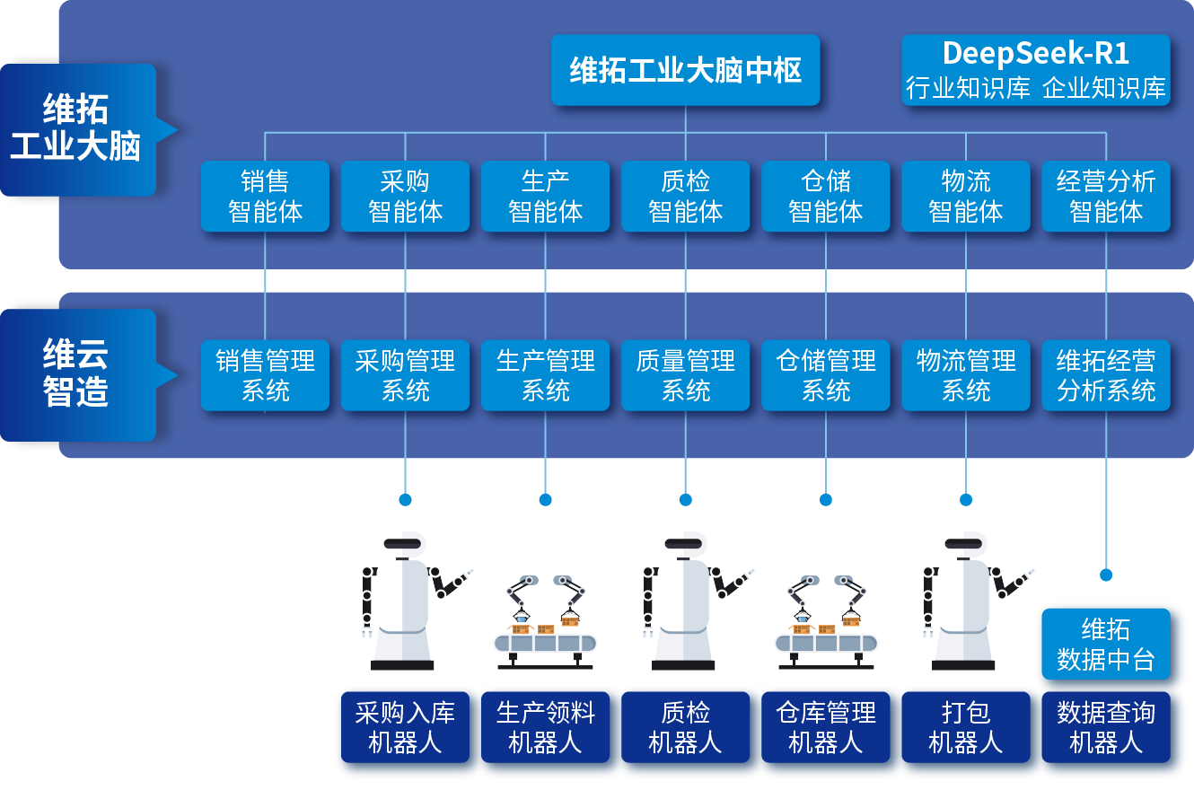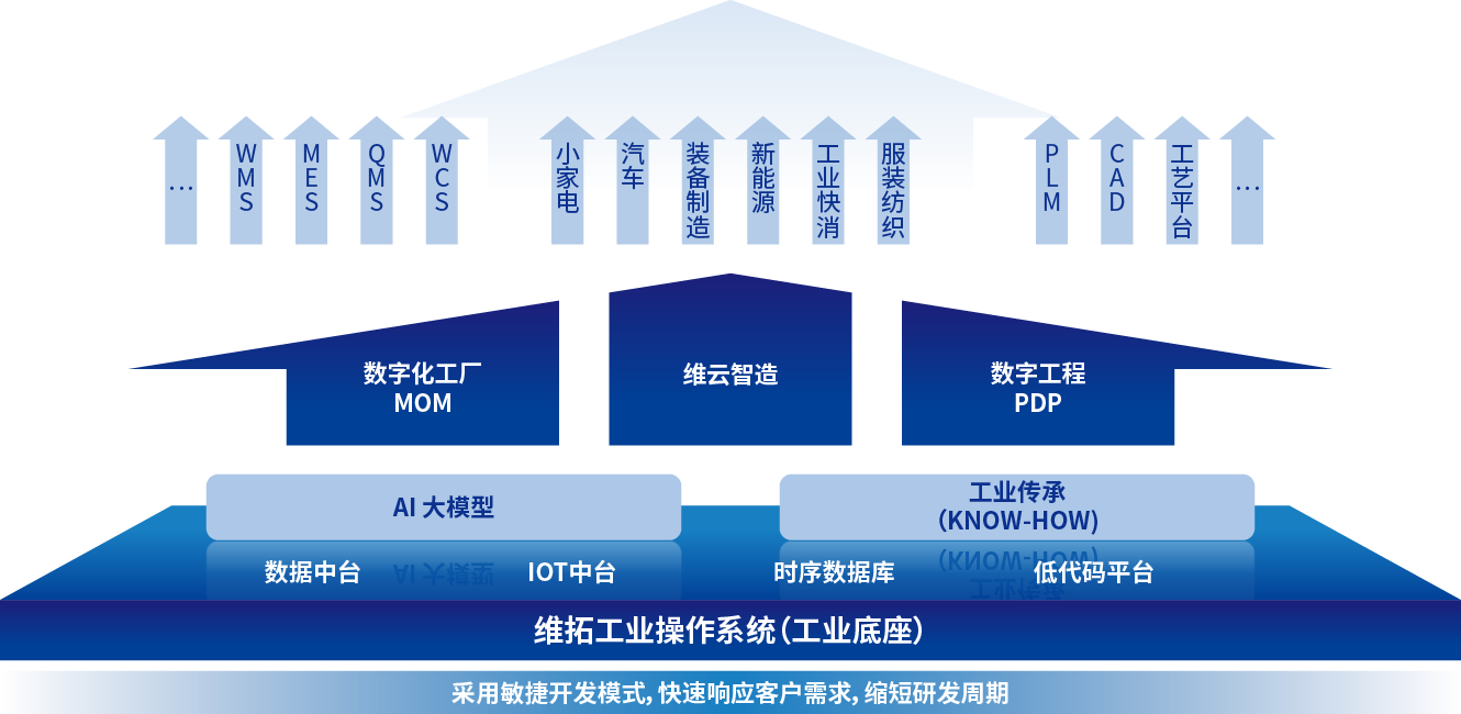 基于维拓AI工业软件底座,构建了以数字工程、制造MOM、维云智造三大核心产品,结合垂直行业工业传承,形成数智化工厂全产业链赋能体系,快速响应客户需求,缩短产品研发上市周期