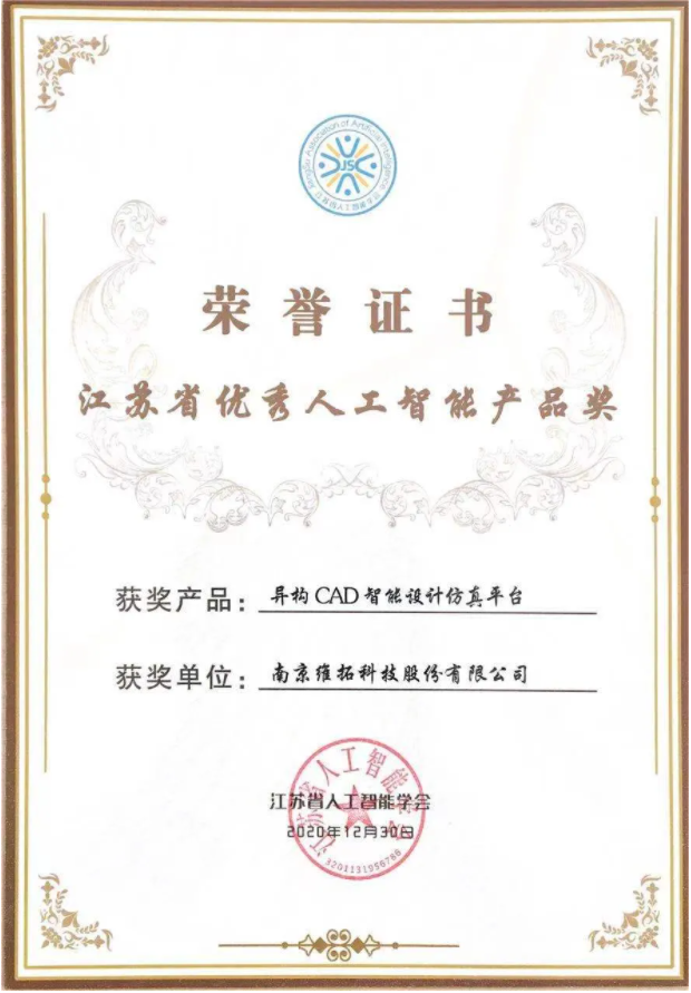 12月30日,由江苏省人工智能学会主办、南京大数据产业协会协办的第三届江苏人工智能大会在南京隆重举行,来自国内人工智能领域的专家学者分享最新研究、共商产业发展大计。在同期举办的“AI之夜”颁奖晚会中,维拓科技凭借创新的 “异构CAD智能设计仿真平台”,荣获“2020年度江苏省人工智能优秀产品奖”。